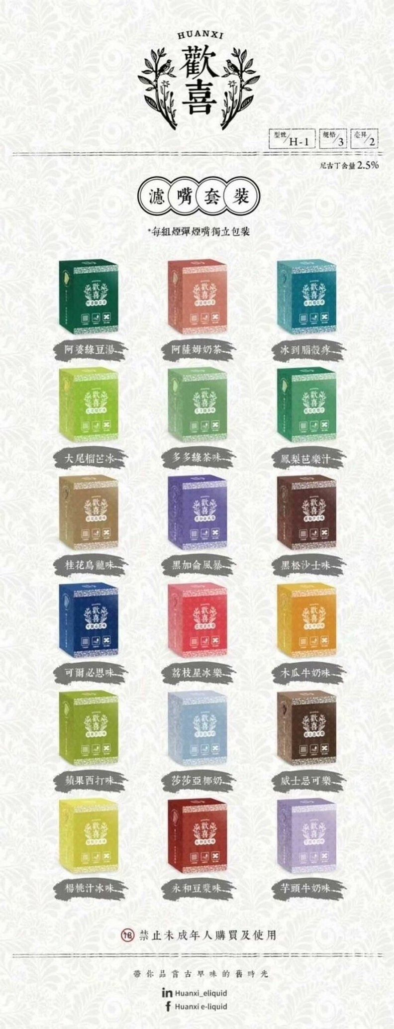 單盒三顆入 膠囊型包裝 扁吸嘴設計 規格:一代通用 口味:26種 容量:1.8ML 丁鹽:3%